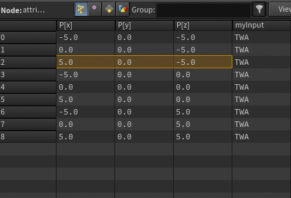 eg) s@myInput = point (1, "info", 0); // 모든 포인트에 대하여 아래 새롭게 정의된 string attribute myInput에 1번 노드인풋으로 들어온 @input의 0번 포인트 값을 저장.