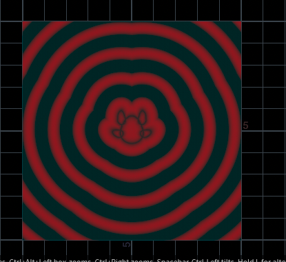 or @Cd.r = sin(d); // sin()을 d에 적용한다면 어떻게 될까? 지금까지 배워왔던 것처럼 d값에 파장의 형태를 띈 색깔 파형이 적용되어 rubbertoy를 중심으로한 rubbertoy모양의 파형을 띄는것을 확인 할 수 있었다. Sine Wave가 적용된 grid의 모든 점들의 위치에서부터 rubbertoy를 구성하는 포인트들중 가장 가까운 포인트의 위치 사이의 거리 길이를 빨간색으로 나타내어라.