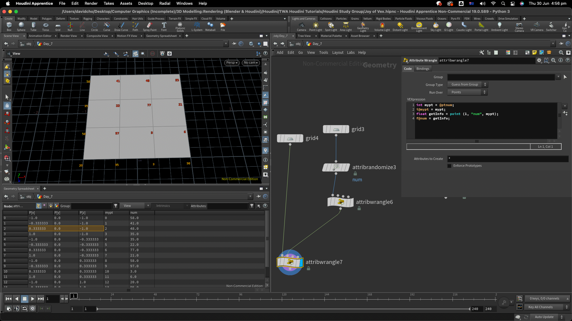 f@num = getInfo; // 방금 선언된 variable getInfo를 float attribute num으로 저장해줌으로써 geometry spreadsheet상에서 각기 다른 point number들의 각기 다른 attribute 값들을 디스플레이 하게함. 이 값들은 Visualisations을 사용하여 Scene View에서 더욱 손 쉽게 어떤 point number에 어떤 Attribute가 할당되어 있는지 확인 가능케 할 수 있음.